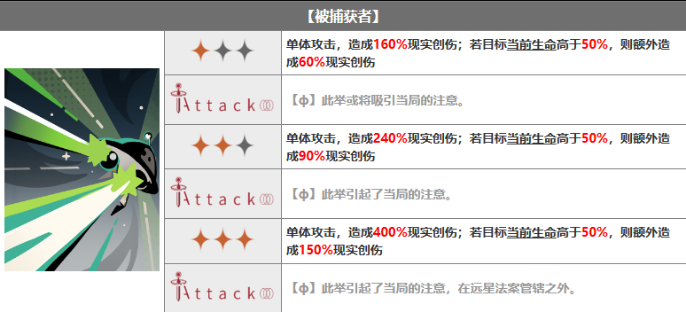 单体攻击,造成160%现实创伤;若目标当前生命高于50%,则额外造成60%现实创伤