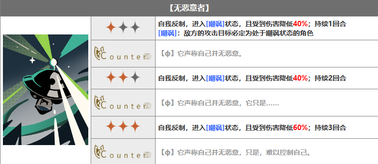 自我反制,进入[嘲讽]状态,且受到伤害降低40%;持续1回合 [嘲讽]:敌方的攻击目标必定为处于嘲讽状态的角色
