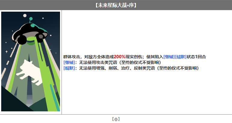 群体攻击,对敌方全体造成200%现实创伤;使其陷入[缴械][绒默]状态1回合