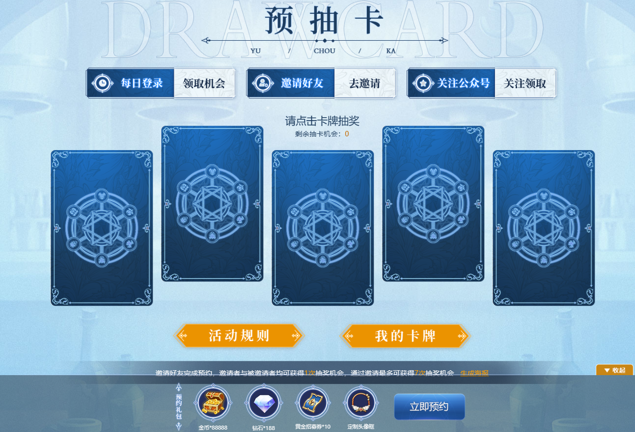 即日起至公测开启前一日,领主大人登录预约页,即可参加本次预抽卡活动!