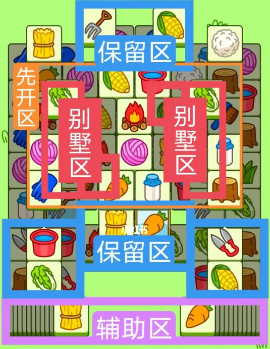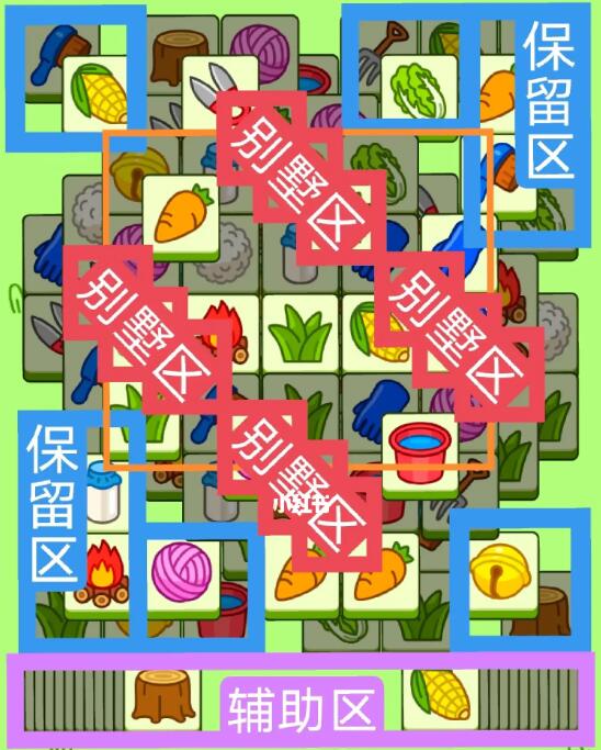 两个L字型大别墅,开局先消除橙色区,然后按照一层层均匀消除表面牌,哪里压牌比较多就先消除哪里,必要时可以用盲盒区辅助消除表面牌,尽量还是以别墅区内互相消除为主,蓝色区有叠牌,但是不多,全部保留到后期使用。