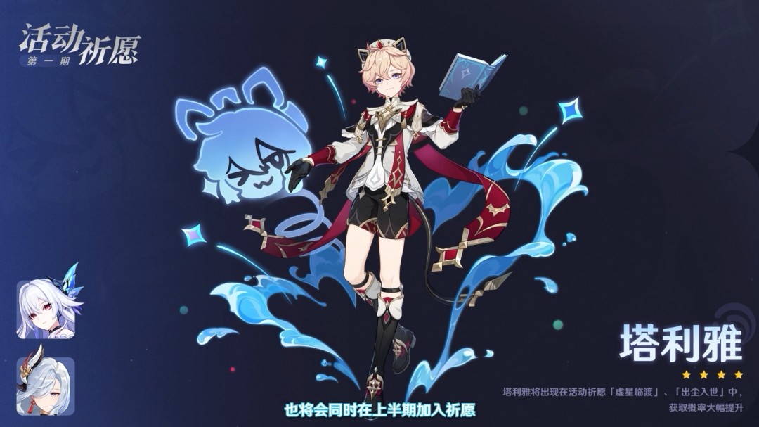 在5.7版本第一期角色活动祈愿中,游戏内将同时开放角色活动祈愿「虚星临渡」与角色活动祈愿-2「出尘入世」。全新限定五星角色「虚渊暗星•丝柯克(冰)」将出现在角色活动祈愿「虚星临渡」中,限定五星角色「孤辰茕怀•申鹤(冰)」则在角色活动祈愿-2「出尘入世」中迎来返场。全新四星角色「颂礼祝祭•塔利雅(水)」将出现在角色活动祈愿「虚星临渡」、「出尘入世」中,获取概率大幅提升。