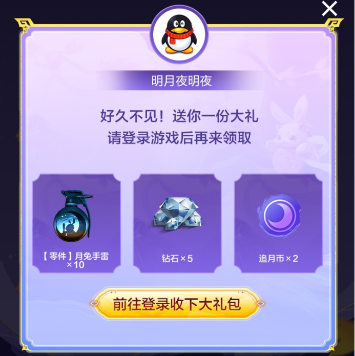 另外,被邀请的回归玩家登录后,还能领到【零件】月兔手雷×10、钻石和追月币,邀请好友一起玩,福利还能翻倍。