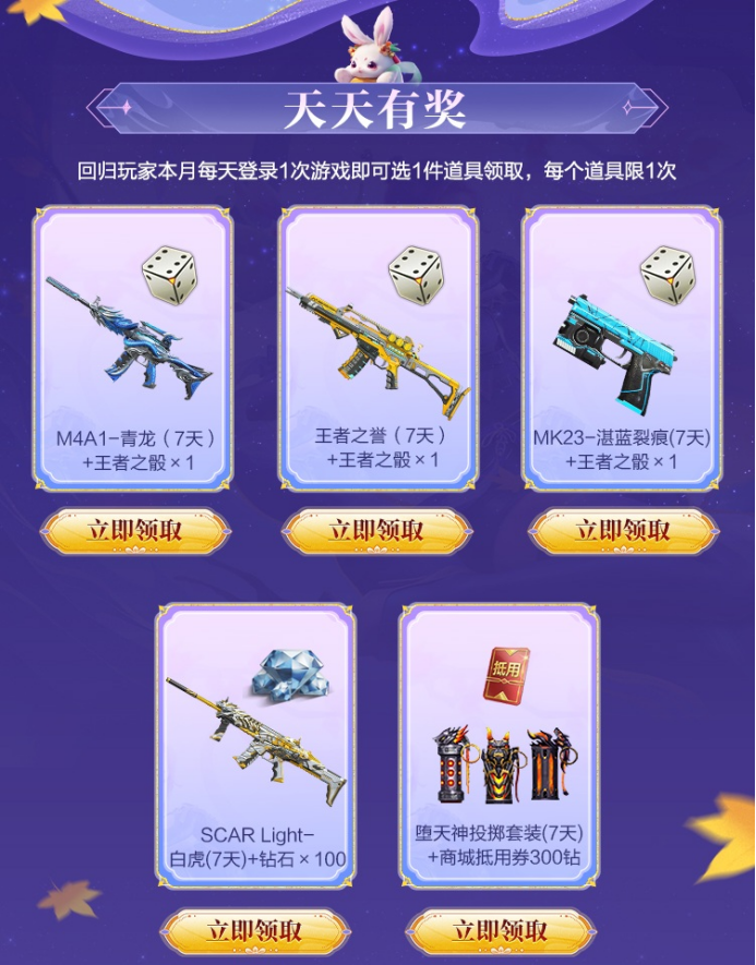 而且10月里每天登录一次,还能在M4A1-青龙(7天)+王者之骰、王者之誉(7天)+王者之骰等福利组合中选一组领取,每组仅限一次,天天都有新惊喜。更划算的是,每天玩1局游戏就能攒100钻石,累计玩满5天,500钻石直接到手,轻松实现“钻石自由”。