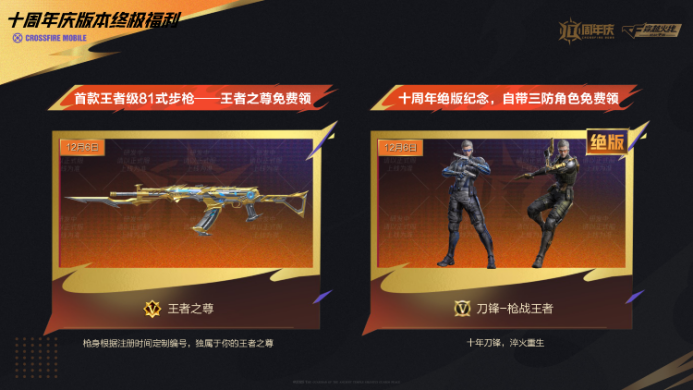 十周年庆版本终极福利为首款王者级81式步枪-王者之尊以及绝版自带三防角色刀锋-枪战王者。王者之尊的枪身有根据注册时间定制的编号,也就是说能够定制独属于你的王者之尊!而英雄级角色刀锋-枪战王者则自带三防属性,情怀与实战价值全部拉满!