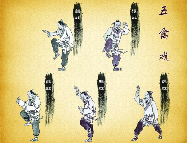 据史书记载,华佗根据中医理论中的阴阳五行、经络运行与脏腑调和之理,结合自己对动物动作的观察,创造出了模仿虎、鹿、熊、猿、鹤五种动物形态的运动方式。