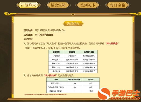 3月25日更新后至4月26日24:00,2010收费免费全服开启【烽火连城】限时福利活动,豪礼拿到手软!决战烽火赢免费秘籍!参与帮会宝箱,抽限定外装!签到礼卡送凡品秘籍影石!每日宝箱 好礼相随!