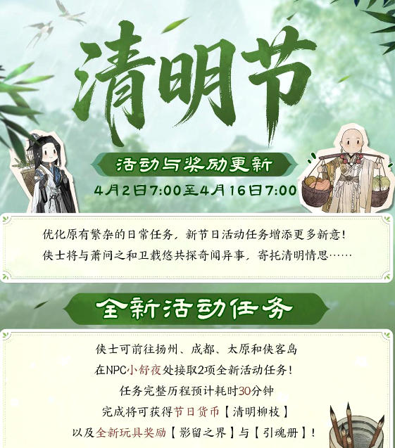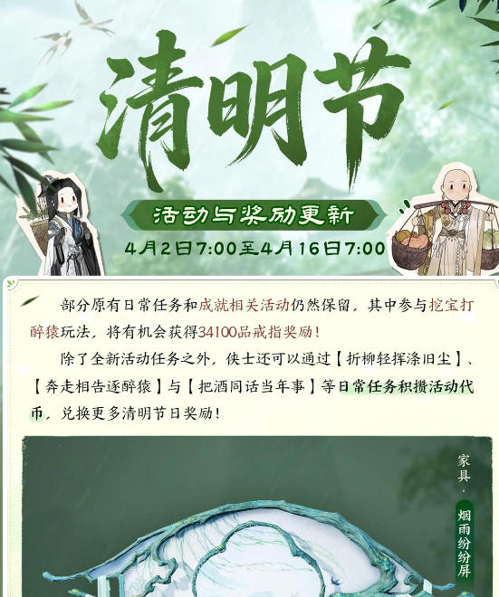 除此之外,侠士还可参与挖宝打醉猿玩法获得34100品戒指奖励,也可完成日常任务积攒活动代币,兑换诸多清明节节日奖励,青柳拂身,百无禁忌!