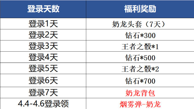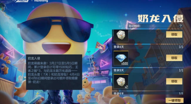 奶龙入侵活动时间为3月27日至5月5日,活动时间共计40天,活动时间比较充裕,在活动时间内只需要登录7天就可以拿下王者之骰、钻石以及奶龙背包等丰厚的奖励啦!特别需要注意的是,在4月4日至4月6日登录,还可以额外领取烟雾弹-奶龙,千万不要忘记!