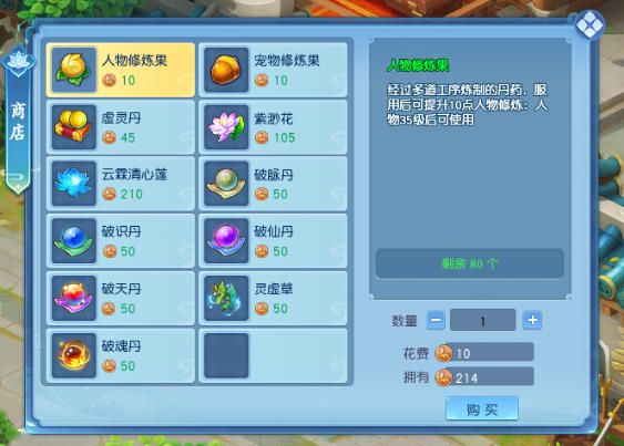 这里还出售一至四阶突破丹药,分别是破脉丹、破识丹、破仙丹和破天丹。仙君在特定等级会遇到修炼瓶颈,而这几款丹药正是突破关卡所必需的关键道具,确保仙君能够持续成长。
