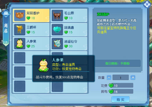 《西游记》中曾提到一种名叫“人参果”的仙果,据说吃了可与天地同寿。这种神奇的果实,在游戏中竟然也存在。只需喂宠物一颗,就能为其恢复500点寿命,虽不能真的与天同寿,但也相当可观了。