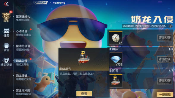 活动期间累计登录7天,即可领取1500钻石+王者之骰*3+奶龙头套(1周)+奶龙背包!4月4日-4月6日期间登录,还可额外领取烟雾弹-奶龙。登录就送,奖励拿到手软,兄弟们千万别错过这波福利哦!