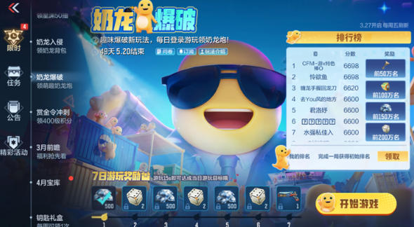 活动期间累计游玩7日,即可领取钻石*1500、王者之骰*6、以及趣味武器“奶龙炮”!每周五还会刷新排行榜,达到前50万、前100万、前150万、前200万,分别可领取英雄之钥、限时典藏之骰、钻石、王者之骰等道具。