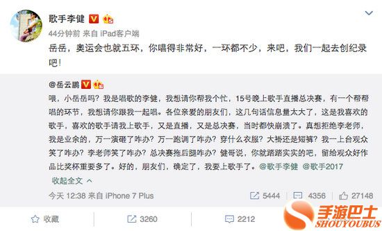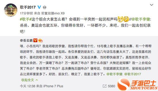 湖南卫视《歌手》下周六晚迎来决赛,而将登台助阵的帮唱嘉宾名单也于近日被网友陆续曝出,近日,岳云鹏发微博表示将正式加盟帮唱李健,随后这一消息也被李健和《歌手》官方微博纷纷转发确认,“音乐诗人”和相声演员的奇妙搭档引起网友关注,而李健在微博上给小岳岳的回复更令人脑洞大开:“这是真的要唱《五环之歌》的节奏啊!”