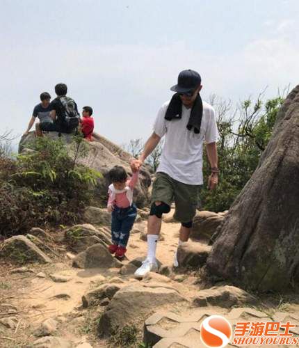 张震背着女儿爬山