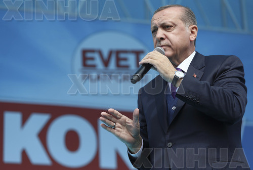 4月14日,在土耳其科尼亚,土耳其总统埃尔多安在支持修宪的集会上讲话。(图片来源:新华社/美联)