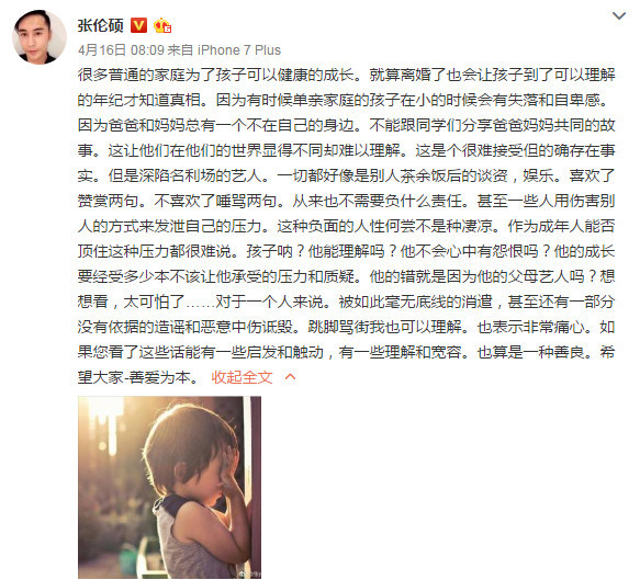 但是深陷名利场的艺人。一切都好像是别人茶余饭后的谈资,娱乐。喜欢了赞赏两句。不喜欢了唾骂两句。从来也不需要负什么责任。甚至一些人用伤害别人的方式来发泄自己的压力。这种负面的人性何尝不是种凄凉。作为成年人能否顶住这种压力都很难说。孩子呐?他能理解吗?他不会心中有怨恨吗?他的成长要经受多少本不该让他承受的压力和质疑。他的错就是因为他的父母艺人吗?想想看,太可怕了……对于一个人来说。被如此毫无底线的消遣,甚至还有一部分没有依据的造谣和恶意中伤诋毁。跳脚骂街我也可以理解。也表示非常痛心。