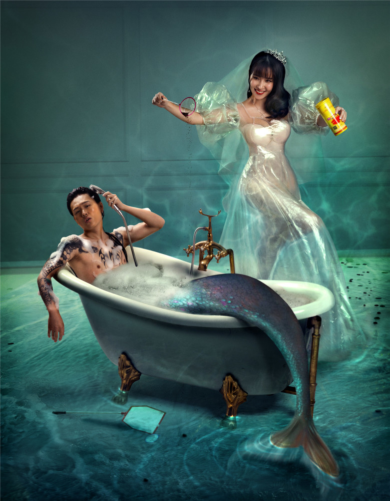 这组照片中,张玮挑战大胆用色和重口味创意,或是裸露上半身和身穿比基尼的爱妻在真空袋中大秀好身材,或是和其一起持枪密室杀人,让不少无法接受的网友直呼:“辣眼睛!张玮你和你老婆是疯了吗?”